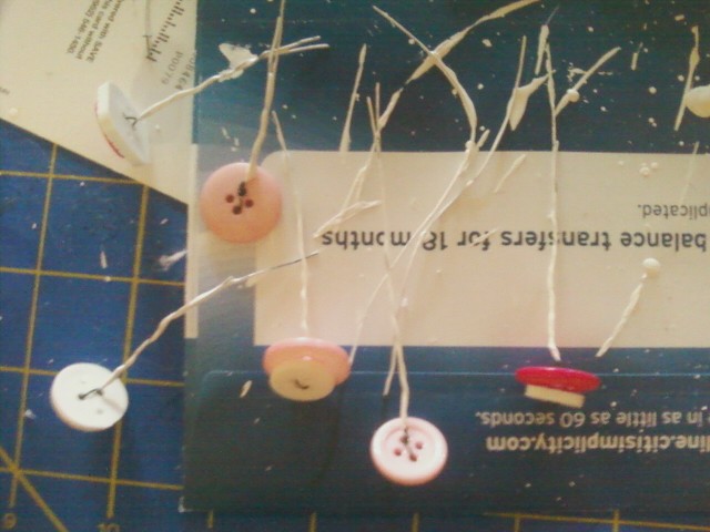 -Next you will start cutting pieces of wire about 7 inches long to thread through the buttons. You will just go up and over and pull through. Then Twist the stem tightly.